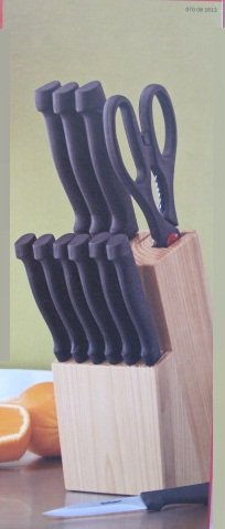 1 Chef's knife, 1 bread knife, 1 utility knife, 1 paring knife, 6 steak knives, 1 pair kitchen shears, 1 wood knife block