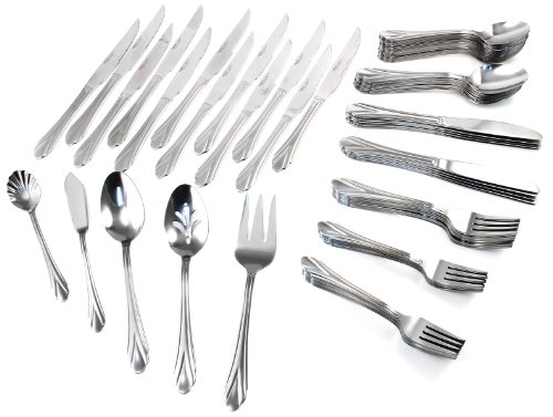 - 101 piece set includes: 12 each of dinner knife, dinner fork, salad fork, dessert fork and tablespoon, 24 teaspoons, 12 steak knives